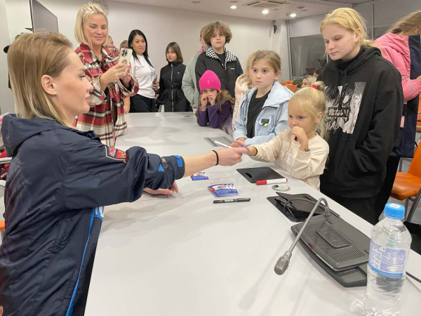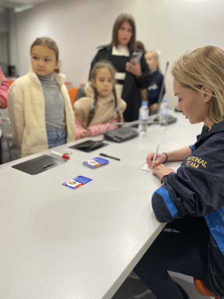 На территории МЛА «Шайба» детям и родителям тренер Гульнара Михайловна провела автограф-сессию со Светланой, после чего все вместе поговорили на интересные темы, касающиеся обучения девочек на льду.